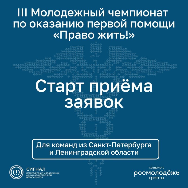 В Санкт-Петербурге и Ленинградской области в третий раз пройдет Молодёжный чемпионат по первой помощи. Цель проекта — популяризировать знания и практические навыки по первой помощи среди молодёжи, сформировать сообщество ответственных граждан, готовых действовать в чрезвычайных ситуациях.